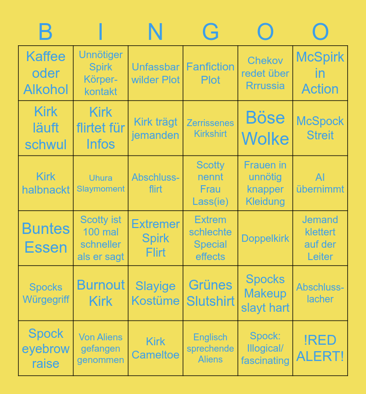 This bingo card has 36 words: Grünes Slutshirt, Slayige Kostüme, Englisch sprechende Aliens, Kirk läuft schwul, Buntes Essen, Scotty nennt Frau Lass(ie), Kirk flirtet für Infos, Kirk Cameltoe, Chekov redet über Rrrussia, Spocks Makeup slayt hart, McSpock Streit, Fanfiction Plot, Abschluss-lacher, Uhura Slaymoment, Zerrissenes Kirkshirt, Kaffee oder Alkohol, Spocks Würgegriff, Frauen in unnötig knapper Kleidung, Kirk halbnackt, Unfassbar wilder Plot, Abschluss-flirt, Scotty ist 100 mal schneller als er sagt, Extrem schlechte Special effects, Extremer Spirk Flirt, Doppelkirk, Unnötiger Spirk Körper- kontakt, Böse Wolke, Von Aliens gefangen genommen, Kirk trägt jemanden, McSpirk in Action, !RED ALERT!, Spock eyebrow raise, Jemand klettert auf der Leiter, AI übernimmt, Burnout Kirk and Spock: Illogical/ fascinating.