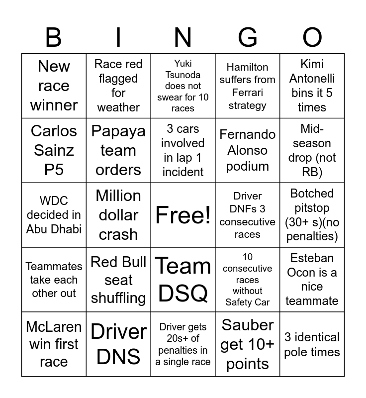 This bingo card has a free space and 24 words: Red Bull seat shuffling, Driver DNS, 3 cars involved in lap 1 incident, McLaren win first race, Kimi Antonelli bins it 5 times, New race winner, Carlos Sainz P5, Race red flagged for weather, Driver DNFs 3 consecutive races, Team DSQ, Fernando Alonso podium, WDC decided in Abu Dhabi, 10 consecutive races without Safety Car, Esteban Ocon is a nice teammate, Papaya team orders, Sauber get 10+ points, Botched pitstop (30+ s)(no penalties), Yuki Tsunoda does not swear for 10 races, Mid-season drop (not RB), Million dollar crash, 3 identical pole times, Teammates take each other out, Hamilton suffers from Ferrari strategy and Driver gets 20s+ of penalties in a single race.