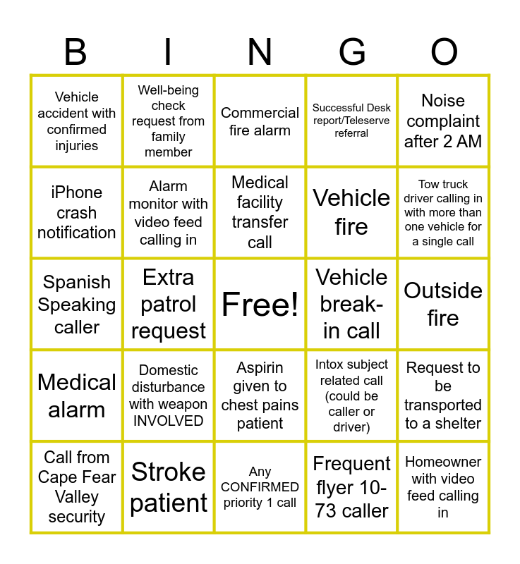 This bingo card has a free space and 24 words: Domestic disturbance with weapon INVOLVED, Stroke patient, Medical facility transfer call, Call from Cape Fear Valley security, Noise complaint after 2 AM, Vehicle accident with confirmed injuries, iPhone crash notification, Well-being check request from family member, Vehicle break-in call, Aspirin given to chest pains patient, Vehicle fire, Spanish Speaking caller, Intox subject related call (could be caller or driver), Request to be transported to a shelter, Alarm monitor with video feed calling in, Frequent flyer 10-73 caller, Outside fire, Commercial fire alarm, Tow truck driver calling in with more than one vehicle for a single call, Extra patrol request, Homeowner with video feed calling in, Medical alarm, Successful Desk report/Teleserve referral and Any CONFIRMED priority 1 call.