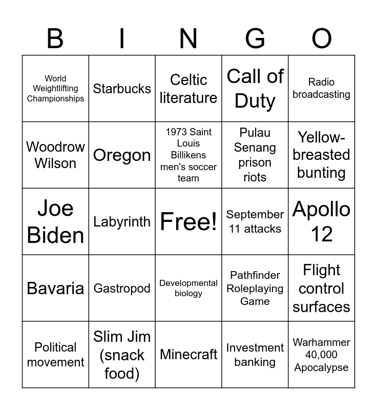 This bingo card has a free space and 24 words: Gastropod, Slim Jim (snack food), 1973 Saint Louis Billikens men's soccer team, Political movement, Radio broadcasting, World Weightlifting Championships, Woodrow Wilson, Starbucks, September 11 attacks, Developmental biology, Pulau Senang prison riots, Joe Biden, Pathfinder Roleplaying Game, Flight control surfaces, Oregon, Investment banking, Apollo 12, Celtic literature, Yellow-breasted bunting, Labyrinth, Warhammer 40,000 Apocalypse, Bavaria, Call of Duty and Minecraft.