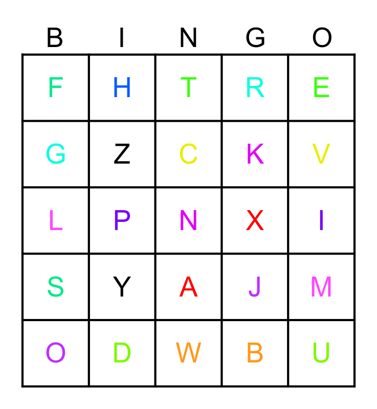 This bingo card has a free space and 26 words: A, B, C, D, E, F, G, H, I, J, K, L, M, O, P, Q, R, S, T, U, V, W, X, Y, Z and Five Little Ducks.