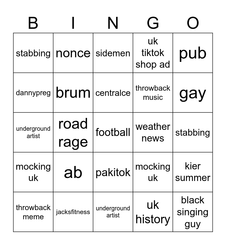 This bingo card has a free space and 24 words: ab, jacksfitness, centralce, throwback meme, pub, stabbing, dannypreg, nonce, weather news, pakitok, throwback music, underground artist, mocking uk, kier summer, brum, uk history, stabbing, sidemen, gay, road rage, black singing guy, mocking uk, uk tiktok shop ad and underground artist.