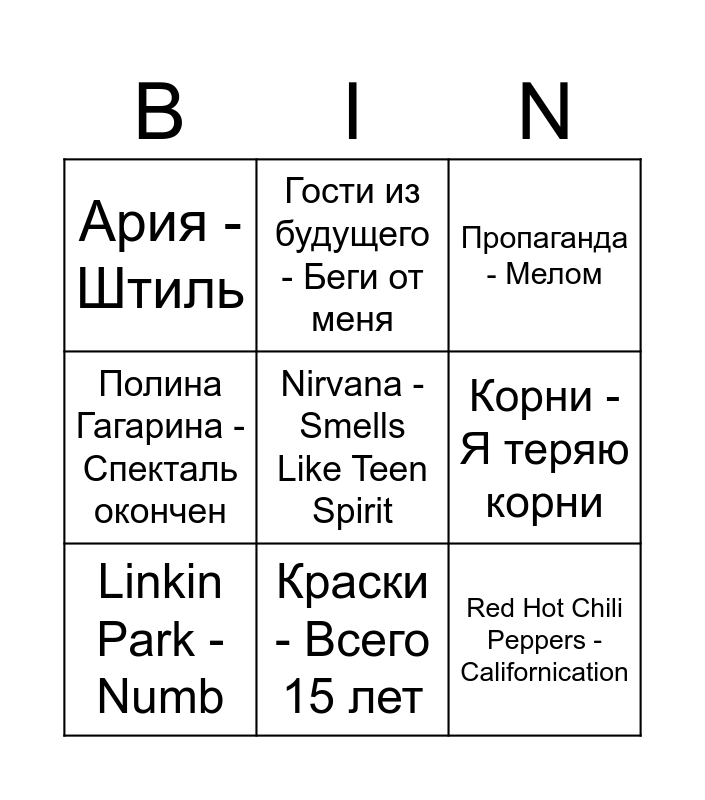 This bingo card has 15 words: Отпетые мошенники - Люби меня, люби, Gorillaz - Feel Good Inc, Пропаганда - Мелом, Ария - Штиль, Краски - Всего 15 лет, Nirvana - Smells Like Teen Spirit, ВИАгра - перемирие, Ляпис Трубецкой - Ты кинула, Корни - Я теряю корни, Red Hot Chili Peppers - Californication, Филипп Киркоров - Я за тебя умру, Полина Гагарина - Спекталь окончен, Linkin Park - Numb, Гости из будущего - Беги от меня and Шура - Ты не верь слезам.