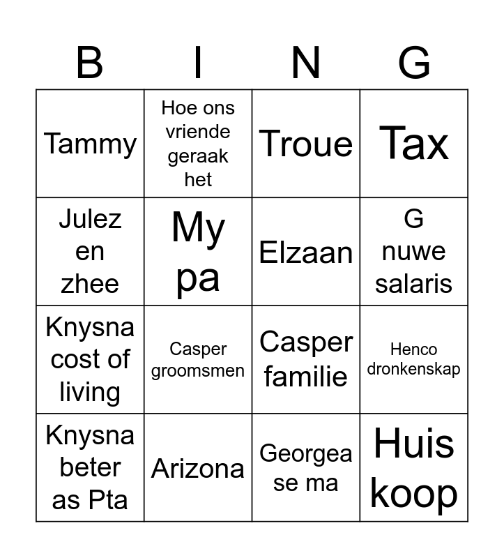 This bingo card has 16 words: Arizona, Henco dronkenskap, Troue, Tammy, Knysna cost of living, Hoe ons vriende geraak het, Casper familie, Georgea se ma, Julez en zhee, My pa, Knysna beter as Pta, Tax, Casper groomsmen, G nuwe salaris, Elzaan and Huis koop.