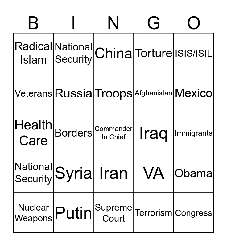 This bingo card has a free space and 24 words: Syria, Putin, Troops, Nuclear Weapons, ISIS/ISIL, Radical Islam, Veterans, National Security, Iraq, Iran, Afghanistan, Health Care, VA, Obama, Russia, Terrorism, Immigrants, China, Mexico, Borders, Congress, National Security, Torture and Supreme Court.