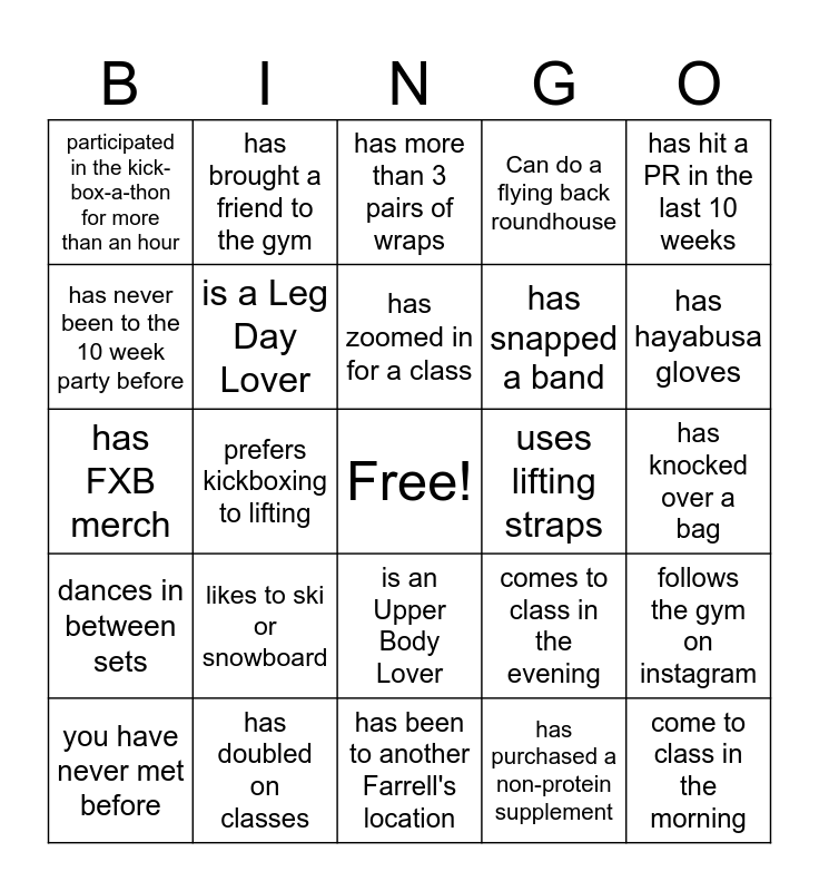 This bingo card has a free space and 35 words: prefers lifting to kickboxing, has worked out in Studio 2, Has been with NOLO for +3 years, is a Leg Day Lover, is an Upper Body Lover, Can do a flying back roundhouse, has never been to the 10 week party before, has a myzone, has zoomed in for a class, has participated in a FIT challenge, has FXB merch, has hit a PR in the last 10 weeks, has had a non-scale victory, meal preps, participated in the kick-box-a-thon for more than an hour, uses lifting straps, has purchased a non-protein supplement, prefers kickboxing to lifting, dances in between sets, come to class in the morning, comes to class in the evening, you have never met before, follows the gym on instagram, has doubled on classes, has more than 3 pairs of wraps, has hayabusa gloves, favorite holiday is christmas, has been to more than 10 countries, has snapped a band, has knocked over a bag, has never lived outside of MN, has been to another Farrell's location, likes to ski or snowboard, has brought a friend to the gym and has a hobby outside of the gym.