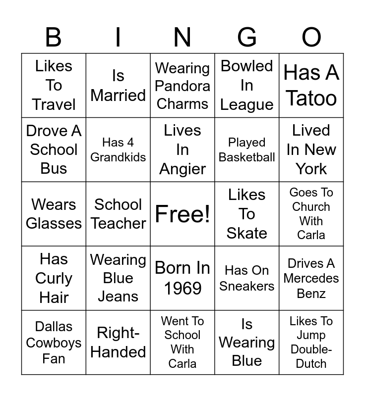 This bingo card has a free space and 24 words: Wearing Blue Jeans, Right-Handed, Lives In Angier, Dallas Cowboys Fan, Has A Tatoo, Likes To Travel, Drove A School Bus, Is Married, Likes To Skate, Born In 1969, Played Basketball, Wears Glasses, Has On Sneakers, Drives A Mercedes Benz, Has 4 Grandkids, Is Wearing Blue, Goes To Church With Carla, Wearing Pandora Charms, Lived In New York, School Teacher, Likes To Jump Double-Dutch, Has Curly Hair, Bowled In League and Went To School With Carla.