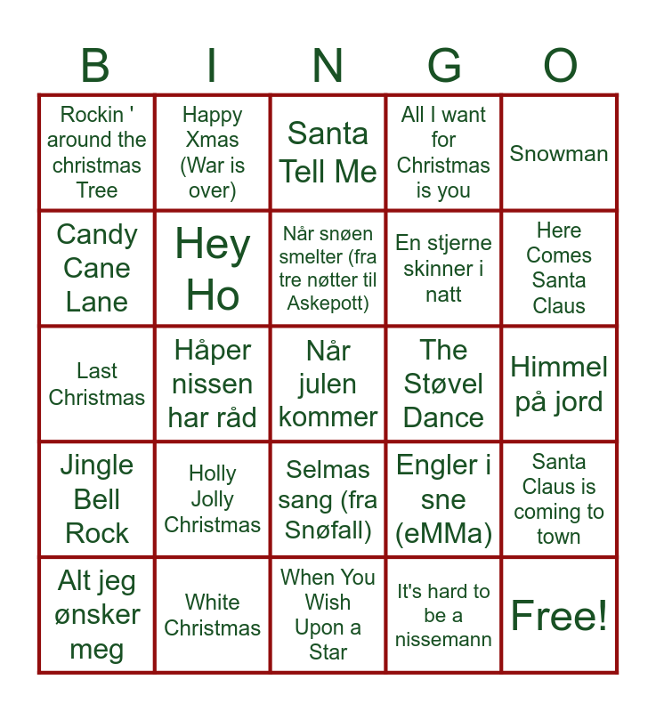 This bingo card has 35 words: Vi tenner våre lykter, Tenn lys, Santa Lucia, Hey Ho, Selmas sang (fra Snøfall), All I want for Christmas is you, Candy Cane Lane, Juletragedien, Når snøen smelter (fra tre nøtter til Askepott), Let it snow! Let it snow! Let it snow!, Last Christmas, Snowman, Home for Christmas, Driving home for Christmas, Rockin ' around the christmas Tree, The Støvel Dance, It's hard to be a nissemann, Håper nissen har råd, Jingle Bell Rock, Når julen kommer, Engler i sne (eMMa), Alt jeg ønsker meg, Santa Claus is coming to town, White Christmas, Santa Tell Me, Here Comes Santa Claus, Free!, Jeg gikk meg over sjø og land, En stjerne skinner i natt, Himmel på jord, Baby It's Cold Outside, When You Wish Upon a Star, Holly Jolly Christmas, Happy Xmas (War is over) and Happy New Year.