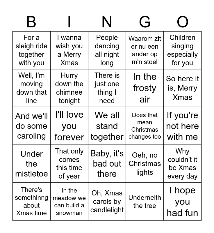 This bingo card has 35 words: Maar ik had 't hok toch goed dicht gedaan, Used to laugh and call him names, Santa, can you hear me, Hurry down the chimnee tonight, Baby, it's bad out there, Waarom zit er nu een ander op m'n stoel, Well, I'm moving down that line, We can spread a smile of joy, There is just one thing I need, I'll give it to someone special, And we'll do some caroling, Children singing especially for you, Let it snow!, Toys in every store, For a sleigh ride together with you, Does that mean Christmas changes too, Underneith the tree, I'll love you forever, Under the mistletoe, We all stand together, Oeh, no Christmas lights, There's somethinng about Xmas time, Why couldn't it be Xmas every day, In the meadow we can build a snowman, People dancing all night long, So here it is, Merry Xmas, I hope you had fun, That's what Xmas means to me, In the frosty air, If you're not here with me, To hear sleighbells in the snow, Oh, Xmas carols by candlelight, That only comes this time of year, I wanna wish you a Merry Xmas and It's the happiest season of all.