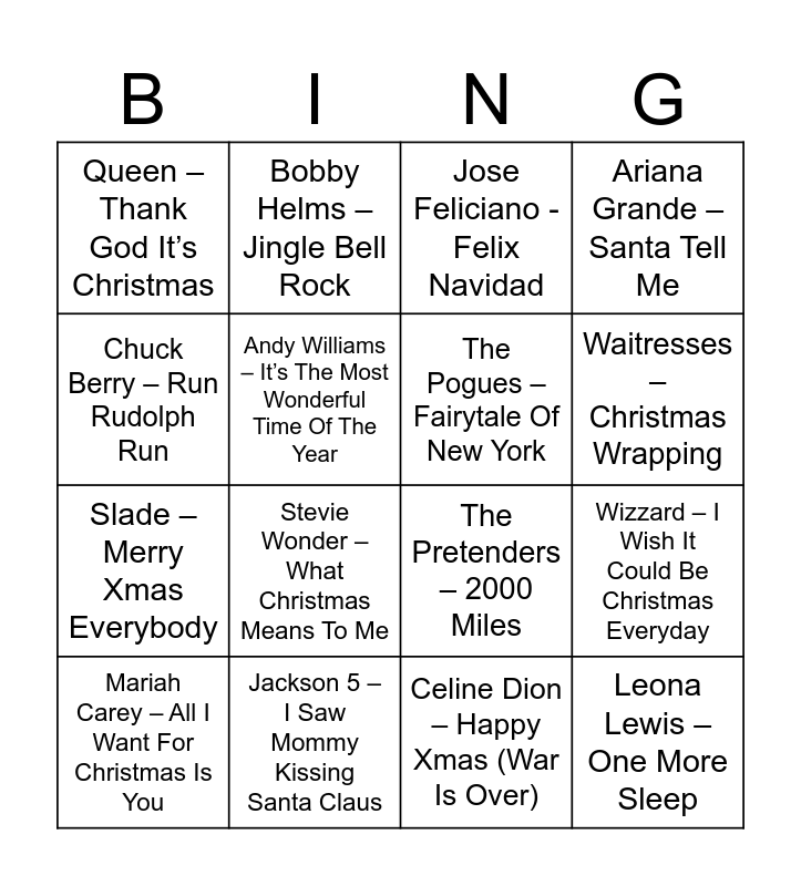 This bingo card has 51 words: Free!, Mariah Carey – All I Want For Christmas Is You, East 17 – Stay Another Day, Wham – Last Christmas, Kelly Clarkson – Underneath The Tree, Shakin’ Stevens – Merry Christmas Everyone, Bobby Helms – Jingle Bell Rock, Brenda Lee – Rockin’ Around The Christmas Tree, Andy Williams – It’s The Most Wonderful Time Of The Year, The Ronettes – Sleigh Ride, The Pogues – Fairytale Of New York, Ariana Grande – Santa Tell Me, Justin Bieber – Under The Mistletoe, Chris Rea – Driving Home For Christmas, Elton John – Step Into Christmas, Band Aid – Do They Know It’s Christmas?, Waitresses – Christmas Wrapping, Jackson 5 – I Saw Mommy Kissing Santa Claus, Eartha Kit – Santa Baby, Chuck Berry – Run Rudolph Run, Wizzard – I Wish It Could Be Christmas Everyday, Burl Ives – A Holly Jolly Christmas, Queen – Thank God It’s Christmas, Slade – Merry Xmas Everybody, Paul McCartney – Simply Having A Wonderful Christmas Time, Jona Lewie – Stop The Cavalry, Stevie Wonder – What Christmas Means To Me, Cliff Richard – Mistletoe & Wine, Boney M. – Mary’s Boy Child, Jose Feliciano - Felix Navidad, Dean Martin – Let It Snow, Michael Bublé – It’s Beginning To Look A Lot Like Christmas, Jackson 5 – Santa Claus Is Coming To Town, Michael Bublé – Walking In A Winter Wonderland, Idina Menzel & Michael Bublé – Baby It’s Cold Outside, Sia – Snowman, The Darkness – Christmas Time (Don’t Let The Bells End), Bing Crosby – White Christmas, Aled Jones – Walking In The Air, MUD – Lonely This Christmas, Celine Dion – Happy Xmas (War Is Over), Leona Lewis – One More Sleep, Frankie Goes To Hollywood – The Power Of Love, Chris De Burgh – A Spaceman Came Travelling, Darlene Love – Christmas (Baby Please Come Home), Gabriella Cilmi – Warm This Winter, The Pretenders – 2000 Miles, John Williams – Somewhere In My Memory, Nat King Cole – The Christmas Song (Merry Christmas To You), Perrie – Christmas Magic and Cliff Richard - On.