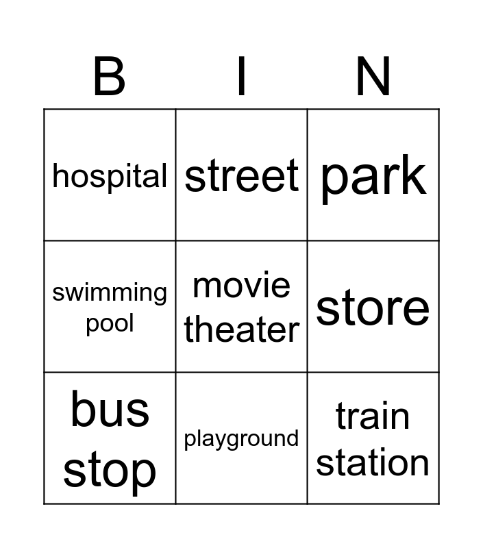 This bingo card has 10 words: playground, park, hospital, movie theater, swimming pool, bus stop, street, cafe, store and train station.