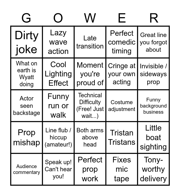 This bingo card has a free space and 29 words: Audience commentary, "Never noticed that before", Funny run or walk, Gower trickery, Dirty joke, Late transition, Cool Lighting Effect, Line flub / hiccup (amateur!), Costume adjustment, Speak up! Can't hear you!, Funny background business, Tony-worthy delivery, Perfect prop work, Fixes mic tape, Invisible / sideways prop, Thaliard gets the turkey leg, Both arms above head, Prop mishap, Great line you forgot about, Actor seen backstage, Tristan Tristans, Flawless transition, Cringe at your own acting, What on earth is Wyatt doing, Perfect comedic timing, Lazy wave action, Little boat sighting, Moment you're proud of and Your favorite moment in the show.