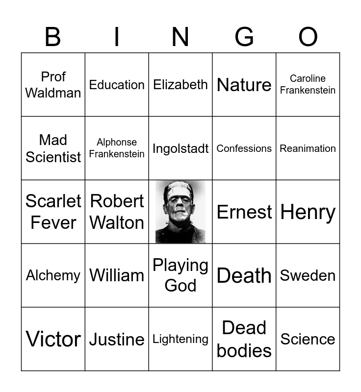 This bingo card has a free space and 29 words: Victor, Creature, Robert Walton, Prof Krempe, Prof Waldman, Elizabeth, Alphonse Frankenstein, William, Ernest, Justine, Henry, Science, Lightening, Dead bodies, Reanimation, Obsession, Playing God, Alchemy, Caroline Frankenstein, Scarlet Fever, Death, Life, Confessions, Mad Scientist, Nature, Education, Sweden, Ingolstadt and North Pole.