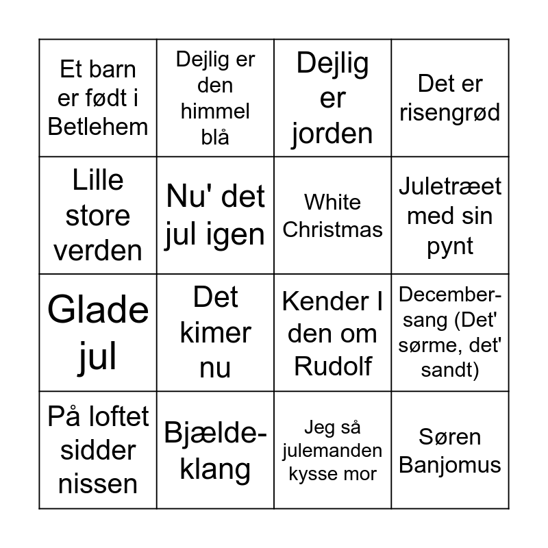 This bingo card has 16 words: Bjælde-klang, December-sang (Det' sørme, det' sandt), Dejlig er jorden, Et barn er født i Betlehem, Glade jul, Dejlig er den himmel blå, Kender I den om Rudolf, Jeg så julemanden kysse mor, Lille store verden, Nu' det jul igen, På loftet sidder nissen, Det er risengrød, Det kimer nu, Juletræet med sin pynt, White Christmas and Søren Banjomus.