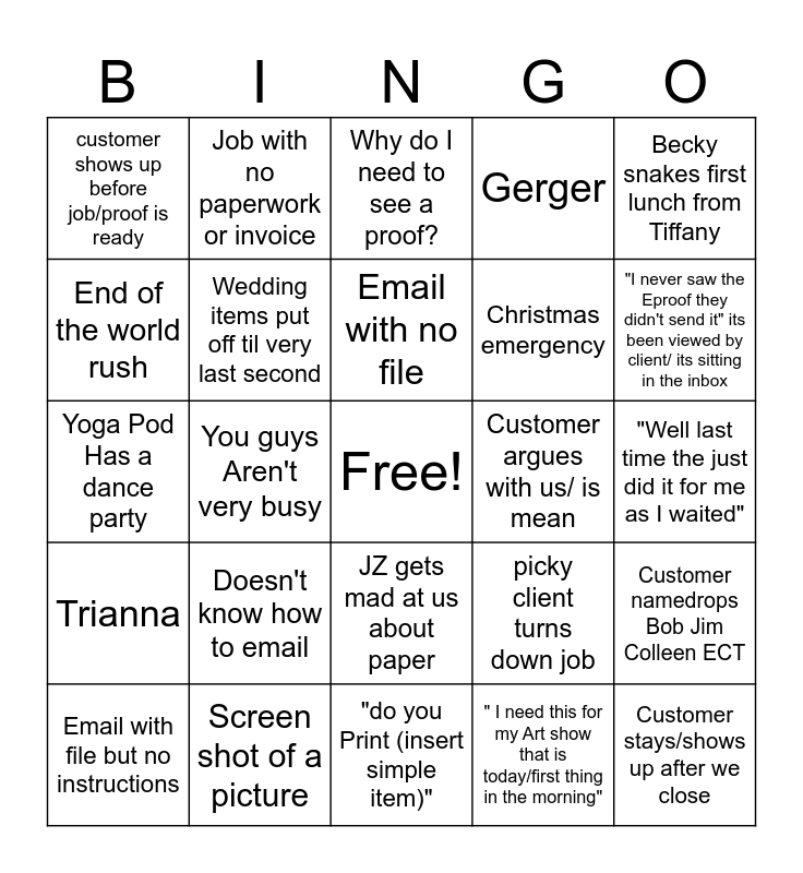 This bingo card has a free space and 24 words: Doesn't know how to email, Screen shot of a picture, Email with no file, Email with file but no instructions, Becky snakes first lunch from Tiffany, customer shows up before job/proof is ready, End of the world rush, Job with no paperwork or invoice, Customer argues with us/ is mean, JZ gets mad at us about paper, Christmas emergency, Yoga Pod Has a dance party, picky client turns down job, Customer namedrops Bob Jim Colleen ECT, Wedding items put off til very last second, " I need this for my Art show that is today/first thing in the morning", "Well last time the just did it for me as I waited", Why do I need to see a proof?, "I never saw the Eproof they didn't send it" its been viewed by client/ its sitting in the inbox, You guys Aren't very busy, Customer stays/shows up after we close, Trianna, Gerger and "do you Print (insert simple item)".