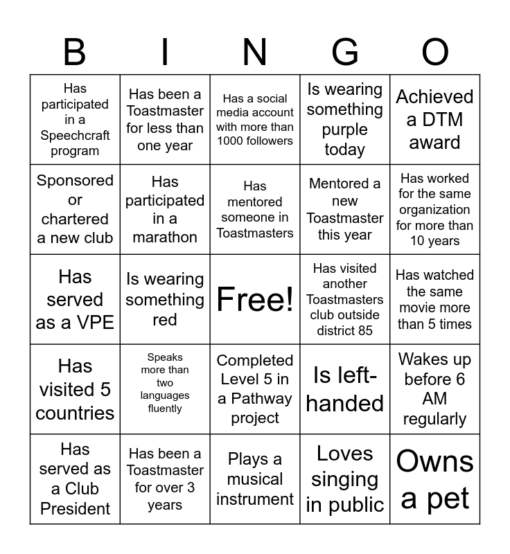 This bingo card has a free space and 24 words: Speaks more than two languages fluently, Has been a Toastmaster for over 3 years, Has mentored someone in Toastmasters, Has served as a Club President, Achieved a DTM award, Has participated in a Speechcraft program, Sponsored or chartered a new club, Has been a Toastmaster for less than one year, Has visited another Toastmasters club outside district 85, Completed Level 5 in a Pathway project, Mentored a new Toastmaster this year, Has served as a VPE, Is left-handed, Wakes up before 6 AM regularly, Has participated in a marathon, Loves singing in public, Has watched the same movie more than 5 times, Has a social media account with more than 1000 followers, Has worked for the same organization for more than 10 years, Is wearing something red, Owns a pet, Has visited 5 countries, Is wearing something purple today and Plays a musical instrument.