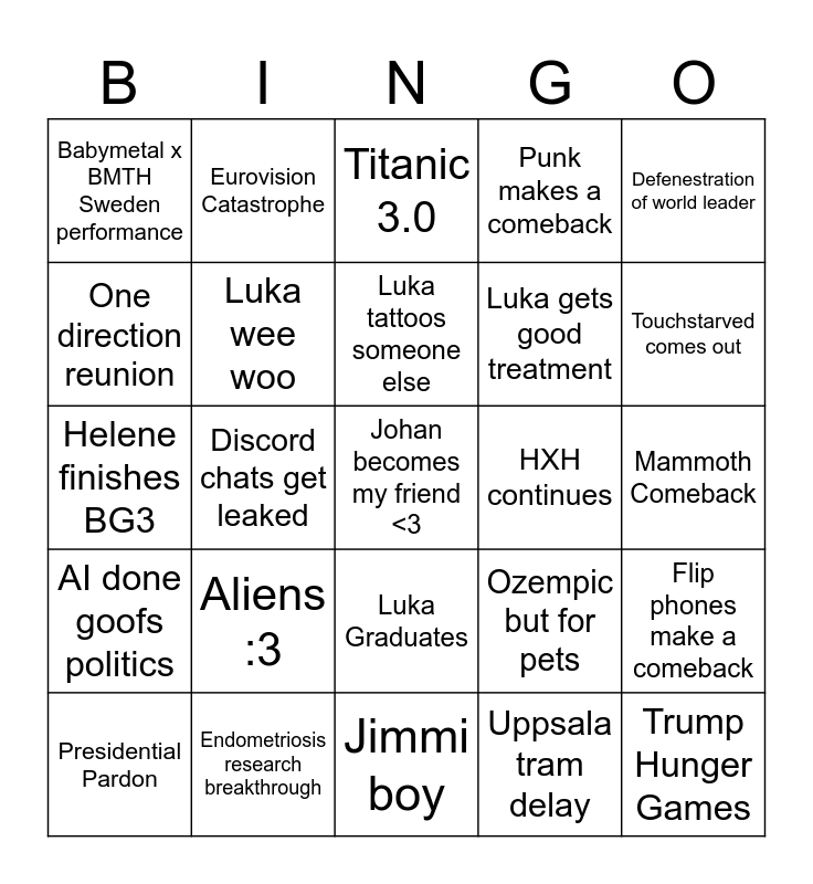 This bingo card has a free space and 24 words: Aliens :3, Endometriosis research breakthrough, Luka tattoos someone else, Presidential Pardon, Defenestration of world leader, Babymetal x BMTH Sweden performance, One direction reunion, Eurovision Catastrophe, HXH continues, Luka Graduates, Luka gets good treatment, Helene finishes BG3, Ozempic but for pets, Flip phones make a comeback, Luka wee woo, Uppsala tram delay, Mammoth Comeback, Titanic 3.0, Touchstarved comes out, Discord chats get leaked, Trump Hunger Games, AI done goofs politics, Punk makes a comeback and Jimmi boy.