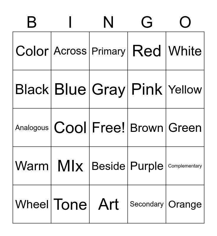 This bingo card has a free space and 24 words: MIx, Tone, Gray, Wheel, White, Color, Black, Across, Brown, Beside, Pink, Analogous, Purple, Complementary, Blue, Secondary, Green, Primary, Yellow, Cool, Orange, Warm, Red and Art.