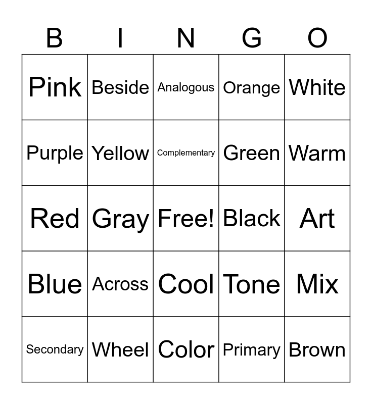 This bingo card has a free space and 24 words: Across, Wheel, Complementary, Secondary, White, Pink, Purple, Beside, Black, Cool, Green, Red, Tone, Mix, Yellow, Primary, Art, Analogous, Warm, Gray, Brown, Blue, Orange and Color.