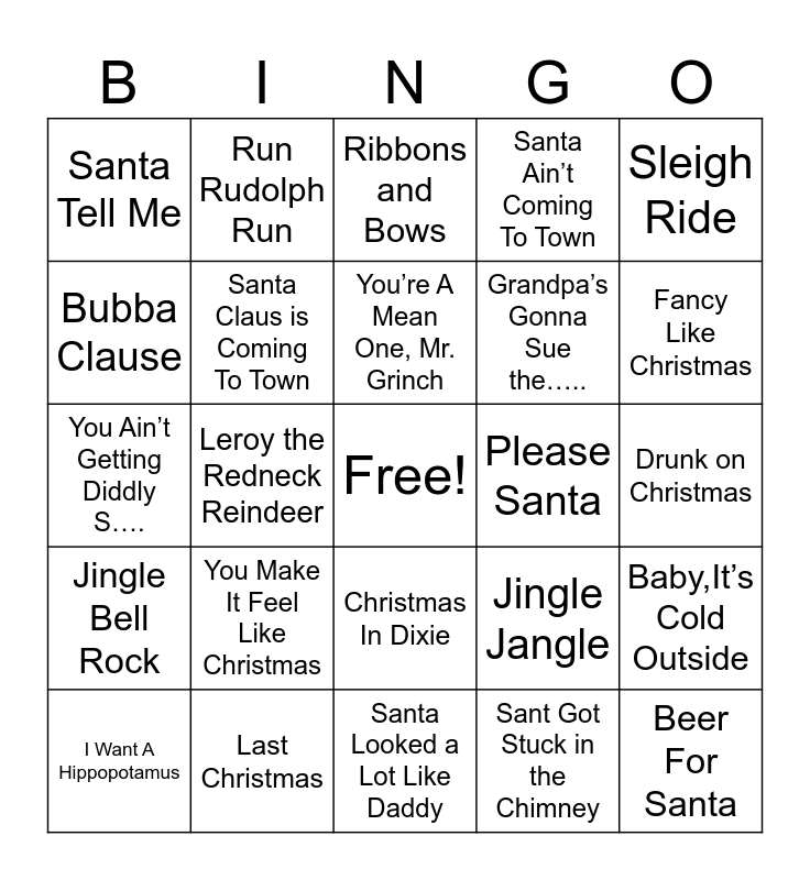 This bingo card has a free space and 31 words: Santa Looked a Lot Like Daddy, Grandma Got Run over by a Reindeer, Leroy the Redneck Reindeer, Holiday Hootenanny, Santa Tell Me, Ribbons and Bows, Santa Claus is Coming To Town, Jingle Jangle, Please Santa, Sant Got Stuck in the Chimney, Drunk on Christmas, Beer For Santa, Stretchy Pants, The Cozy Song, Fancy Like Christmas, Holiday Party, Baby,It’s Cold Outside, You Make It Feel Like Christmas, Jingle Bell Rock, Christmas In Dixie, Sleigh Ride, Don’t Be A Jerk, I Want A Hippopotamus, Run Rudolph Run, Grandpa’s Gonna Sue the….., Bubba Clause, Santa Ain’t Coming To Town, You Ain’t Getting Diddly S…., Last Christmas, You’re A Mean One, Mr. Grinch and Up On The Housetop.