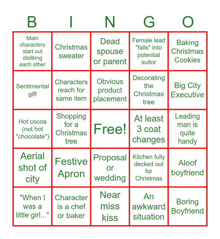 This bingo card has a free space and 24 words: Festive Apron, Character is a chef or baker, Obvious product placement, "When I was a little girl...", Baking Christmas Cookies, Main characters start out disliking each other, Sentimental gift, Christmas sweater, At least 3 coat changes, Proposal or wedding, Decorating the Christmas tree, Hot cocoa (not hot "chocolate"), Kitchen fully decked out for Christmas, Aloof boyfriend, Characters reach for same item, An awkward situation, Leading man is quite handy, Dead spouse or parent, Big City Executive, Shopping for a Christmas tree, Boring Boyfriend, Aerial shot of city, Female lead "falls" into potential suitor and Near miss kiss.