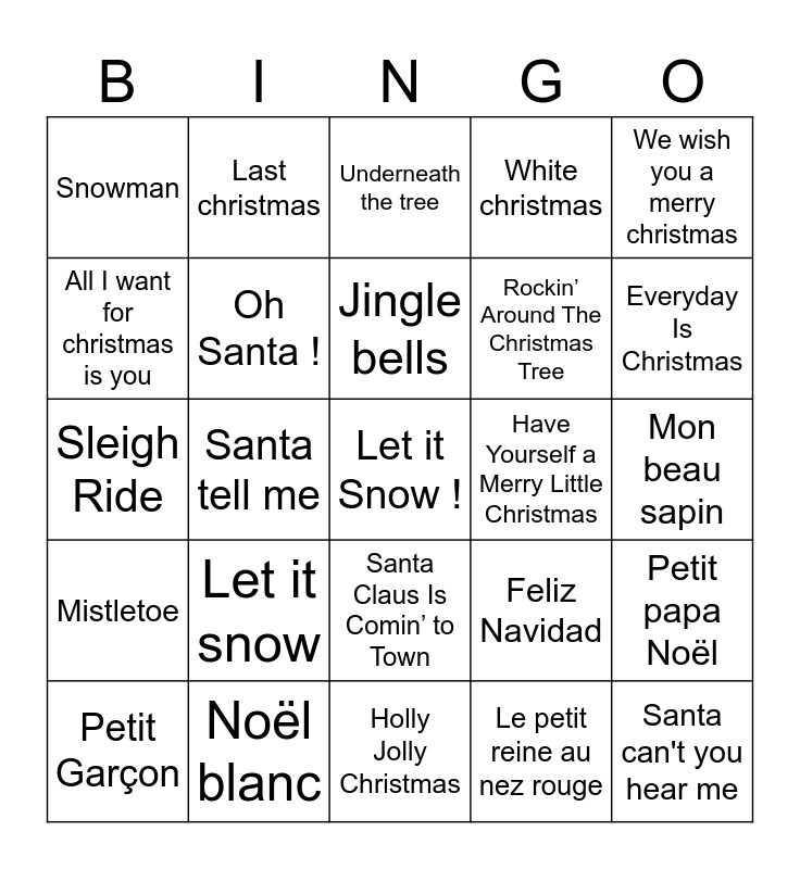 This bingo card has a free space and 24 words: Let it snow, Noël blanc, Jingle bells, Petit Garçon, We wish you a merry christmas, Snowman, All I want for christmas is you, Last christmas, Have Yourself a Merry Little Christmas, Santa Claus Is Comin’ to Town, Rockin’ Around The Christmas Tree, Sleigh Ride, Feliz Navidad, Petit papa Noël, Oh Santa !, Le petit reine au nez rouge, Mon beau sapin, Underneath the tree, Everyday Is Christmas, Santa tell me, Santa can't you hear me, Mistletoe, White christmas and Holly Jolly Christmas.