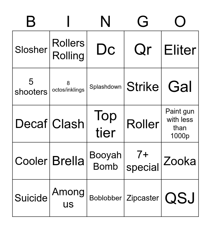 This bingo card has a free space and 24 words: Brella, Among us, Splashdown, Suicide, Eliter, Slosher, 5 shooters, Rollers Rolling, Roller, Booyah Bomb, Strike, Decaf, 7+ special, Zooka, 8 octos/inklings, Zipcaster, Paint gun with less than 1000p, Dc, Gal, Clash, QSJ, Cooler, Qr and Boblobber.