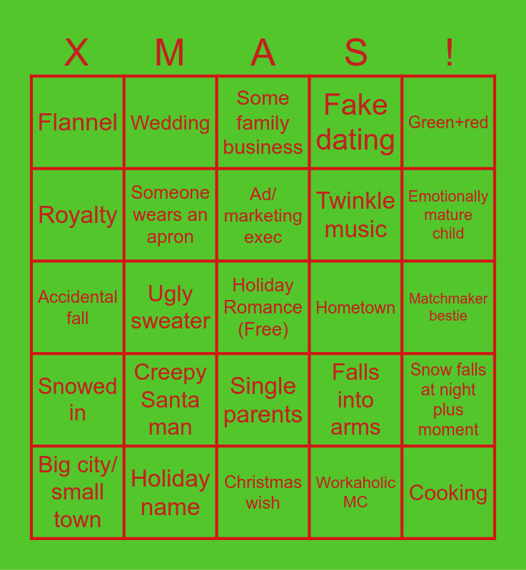 This bingo card has a free space and 24 words: Creepy Santa man, Holiday name, Ad/ marketing exec, Big city/ small town, Green+red, Flannel, Royalty, Wedding, Hometown, Single parents, Twinkle music, Accidental fall, Falls into arms, Snow falls at night plus moment, Someone wears an apron, Workaholic MC, Matchmaker bestie, Some family business, Emotionally mature child, Ugly sweater, Cooking, Snowed in, Fake dating and Christmas wish.