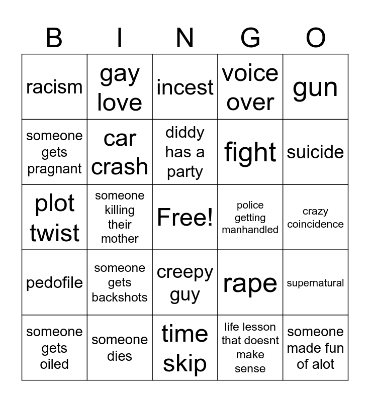 This bingo card has a free space and 24 words: someone gets backshots, someone dies, diddy has a party, someone gets oiled, gun, racism, someone gets pragnant, gay love, police getting manhandled, creepy guy, fight, plot twist, rape, supernatural, car crash, life lesson that doesnt make sense, crazy coincidence, incest, suicide, someone killing their mother, someone made fun of alot, pedofile, voice over and time skip.