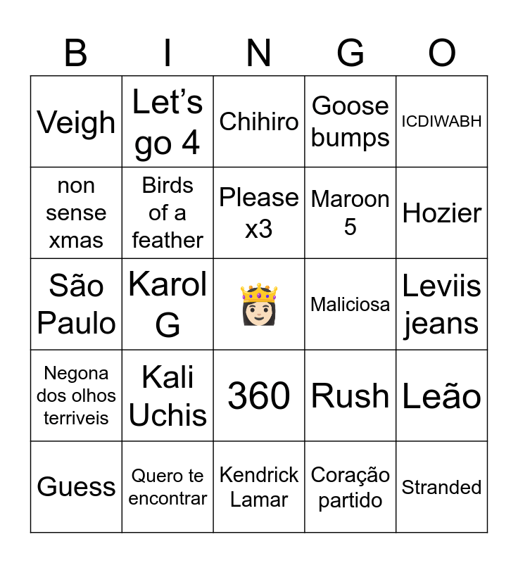 This bingo card has a free space and 39 words: HOT TO GO, Espresso, CAJU, Birds of a feather, Guess, 360, Please x3, Fortnight, ICDIWABH, Negona dos olhos terriveis, Karol G, Goose bumps, Stranded, Leviis jeans, Maliciosa, Kali Uchis, Texas Hold ‘em, Veigh, Ariana Grande, Rush, non sense xmas, Kendrick Lamar, Maroon 5, Hozier, Alibi, Lady Gaga, Odara, Dua Lipa, Jungle, Let’s go 4, MTG anos 2000, us., Chihiro, Quero te encontrar, Coração partido, Keane, Leão, São Paulo and Jão.