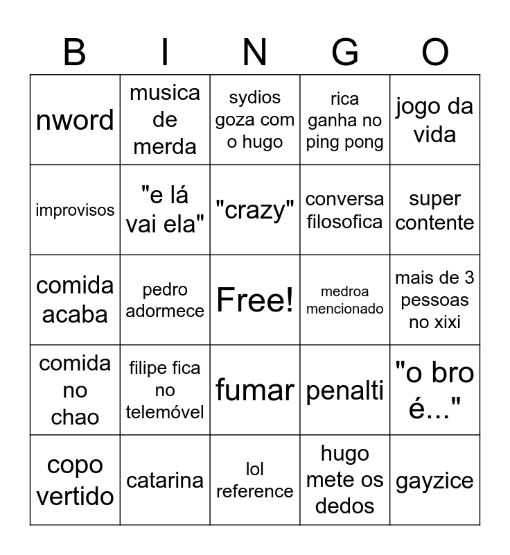 This bingo card has a free space and 29 words: copo vertido, marques vomita, pedro adormece, "matem-se", nword, sydios goza com o hugo, "e lá vai ela", filipe fica no telemóvel, medroa mencionado, catarina, mais de 3 pessoas no xixi, gayzice, lol reference, hugo mete os dedos, super contente, europapa, fumar, comida no chao, jogo da vida, comida acaba, penalti, alguem parte alguma coisa, conversa filosofica, improvisos, rica ganha no ping pong, musica de merda, "o bro é...", "crazy" and "vitor".