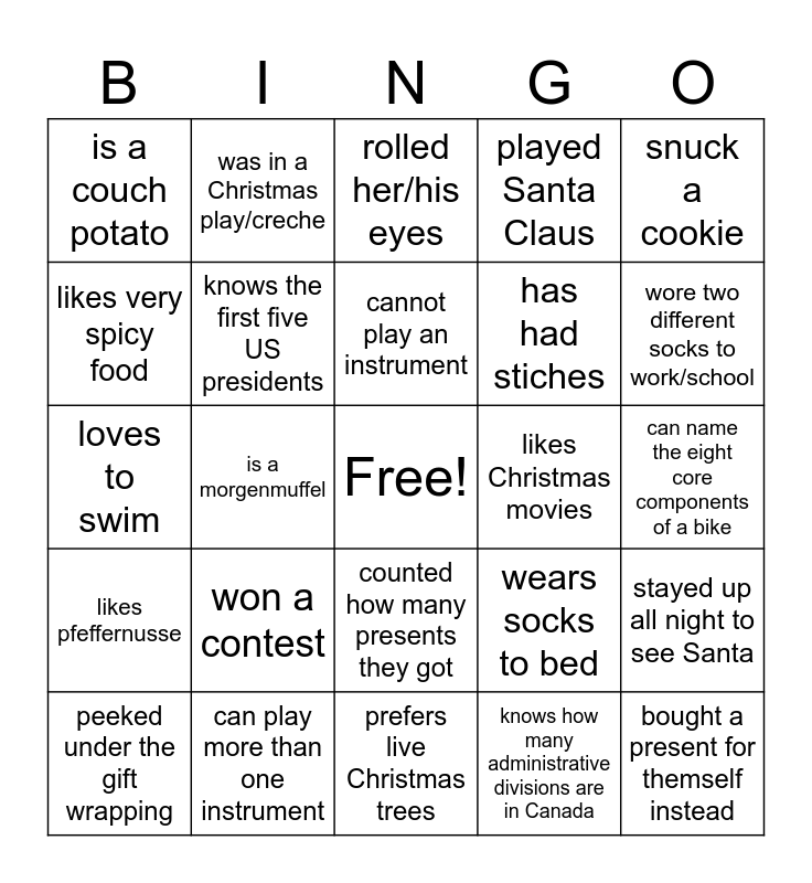 This bingo card has a free space and 24 words: won a contest, can play more than one instrument, cannot play an instrument, peeked under the gift wrapping, snuck a cookie, is a couch potato, likes very spicy food, was in a Christmas play/creche, likes Christmas movies, counted how many presents they got, has had stiches, loves to swim, wears socks to bed, stayed up all night to see Santa, knows the first five US presidents, knows how many administrative divisions are in Canada, can name the eight core components of a bike, rolled her/his eyes, wore two different socks to work/school, is a morgenmuffel, bought a present for themself instead, likes pfeffernusse, played Santa Claus and prefers live Christmas trees.