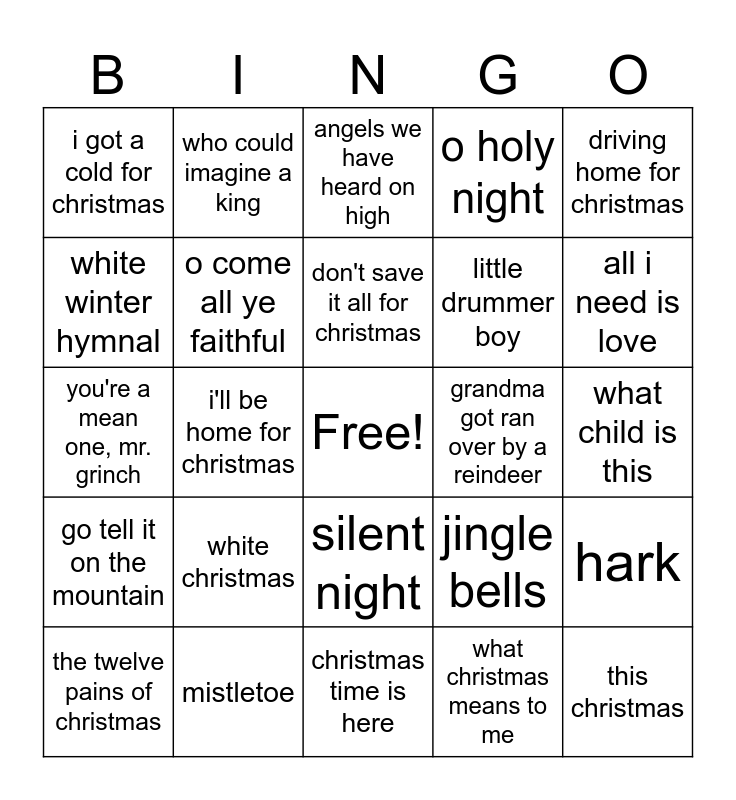This bingo card has a free space and 24 words: white christmas, mistletoe, don't save it all for christmas, the twelve pains of christmas, driving home for christmas, i got a cold for christmas, white winter hymnal, who could imagine a king, grandma got ran over by a reindeer, silent night, little drummer boy, you're a mean one, mr. grinch, jingle bells, hark, o come all ye faithful, what christmas means to me, what child is this, angels we have heard on high, all i need is love, i'll be home for christmas, this christmas, go tell it on the mountain, o holy night and christmas time is here.