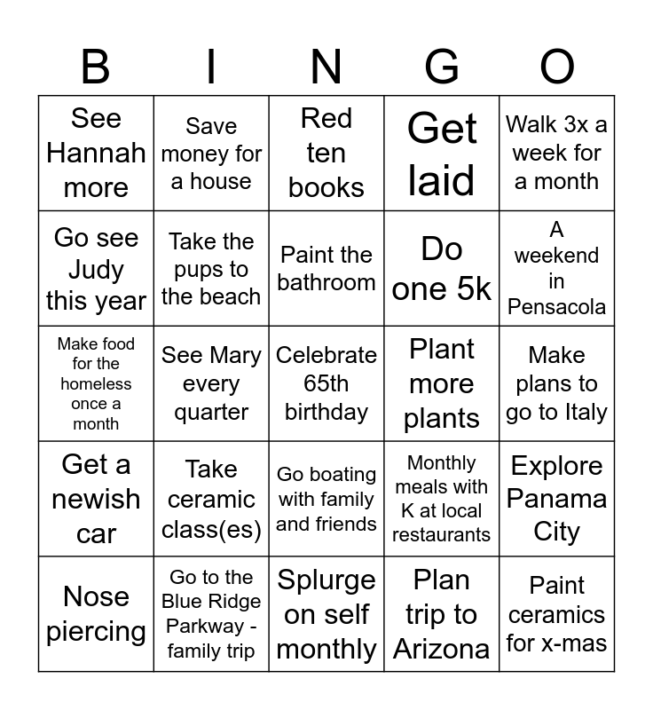 This bingo card has a free space and 24 words: Nose piercing, Take ceramic class(es), Paint the bathroom, Plan trip to Arizona, Walk 3x a week for a month, See Hannah more, Save money for a house, Red ten books, Plant more plants, Make plans to go to Italy, Make food for the homeless once a month, Take the pups to the beach, Monthly meals with K at local restaurants, Explore Panama City, Go see Judy this year, Go to the Blue Ridge Parkway - family trip, Splurge on self monthly, Get laid, A weekend in Pensacola, Get a newish car, See Mary every quarter, Go boating with family and friends, Do one 5k and Paint ceramics for x-mas.