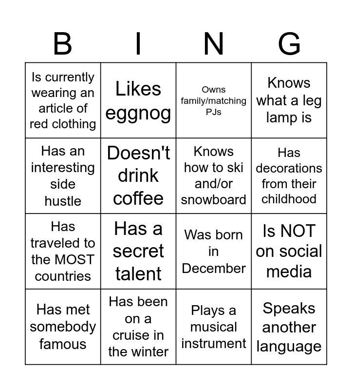 This bingo card has 16 words: Has been on a cruise in the winter, Is NOT on social media, Owns family/matching PJs, Is currently wearing an article of red clothing, Has traveled to the MOST countries, Likes eggnog, Was born in December, Plays a musical instrument, Has an interesting side hustle, Doesn't drink coffee, Has met somebody famous, Knows what a leg lamp is, Has a secret talent, Has decorations from their childhood, Knows how to ski and/or snowboard and Speaks another language.