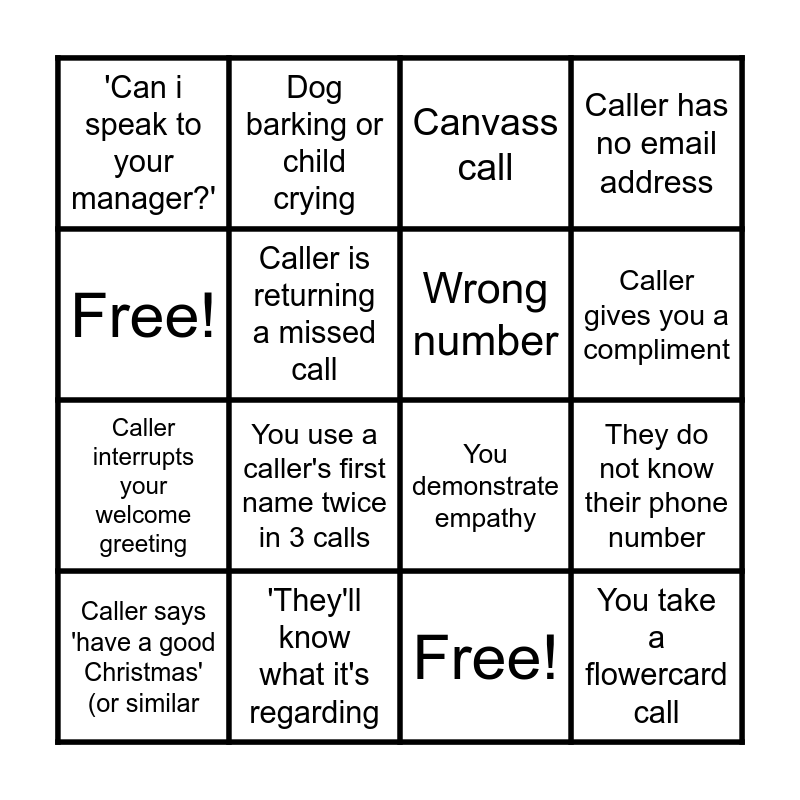This bingo card has 16 words: 'They'll know what it's regarding, They do not know their phone number, Canvass call, 'Can i speak to your manager?', Caller interrupts your welcome greeting, Dog barking or child crying, You demonstrate empathy, Free!, Free!, Caller is returning a missed call, Caller says 'have a good Christmas' (or similar, Caller has no email address, You use a caller's first name twice in 3 calls, Caller gives you a compliment, Wrong number and You take a flowercard call.