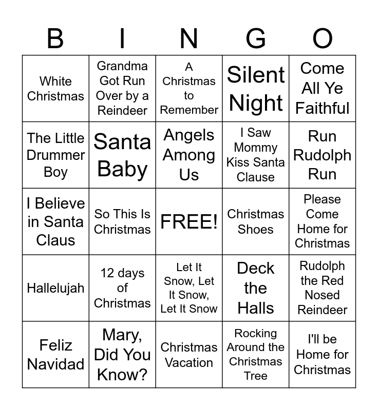 This bingo card has a free space and 49 words: Frosty the Snowman, I'll be Home for Christmas, All I want for Christmas is You, Christmas Vacation, 12 days of Christmas, Jingle Bell Rock, Grandma Got Run Over by a Reindeer, Jingle Bells, The Little Drummer Boy, Blue Christmas, Santa Baby, Silent Night, Rudolph the Red Nosed Reindeer, Deck the Halls, It's Beginning to Look a Lot Like Christmas, It's the Most Wonderful Time of the Year, Angels Among Us, Christmas Shoes, Sleigh Ride, Come All Ye Faithful, So This Is Christmas, Rocking Around the Christmas Tree, White Christmas, I Saw Mommy Kiss Santa Clause, Holly Jolly Christmas, Run Rudolph Run, Feliz Navidad, Have Yourself a Merry Little Christmas, Let It Snow, Let It Snow, Let It Snow, Hallelujah, Away in a Manger, Hard Candy Christmas, Do You Hear What I Hear, We Wish You Merry Christmas, Mary, Did You Know?, You're a Mean One, Mr. Grinch, Baby, It's Cold Outside, The Chipmunk Song, Please Come Home for Christmas, Santa Bring My Baby Back to Me, Up on the Housetop, Jolly Ole St. Nicholas, All I Want for Christmas is You, Christmas Without You, I Believe in Santa Claus, A Christmas to Remember, The Greatest Gift of All, The Christmas Guest and Joy to the World.