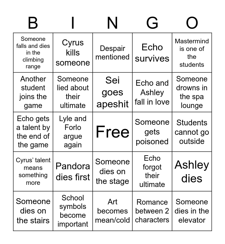 This bingo card has a free space and 24 words: Pandora dies first, School symbols become important, Sei goes apeshit, Someone dies on the stairs, Mastermind is one of the students, Someone falls and dies in the climbing range, Another student joins the game, Cyrus kills someone, Someone gets poisoned, Someone dies on the stage, Echo and Ashley fall in love, Echo gets a talent by the end of the game, Echo forgot their ultimate, Ashley dies, Someone lied about their ultimate, Romance between 2 characters, Students cannot go outside, Despair mentioned, Someone drowns in the spa lounge, Lyle and Forlo argue again, Someone dies in the elevator, Cyrus’ talent means something more, Echo survives and Art becomes mean/cold.