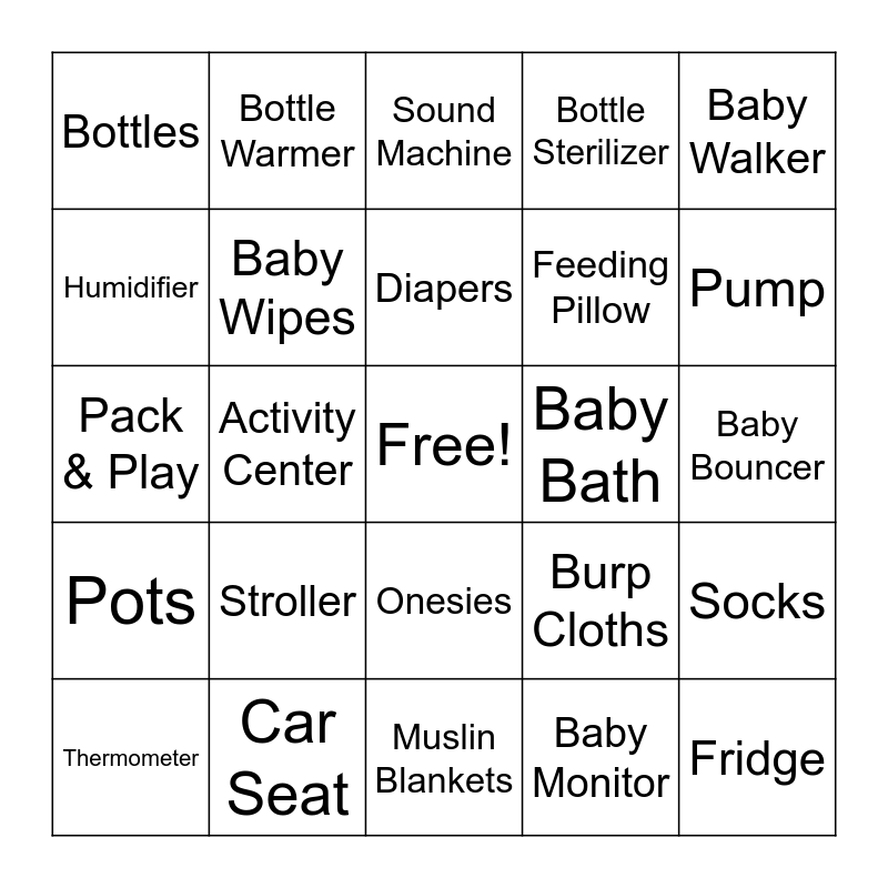 This bingo card has a free space and 24 words: Stroller, Car Seat, Diapers, Thermometer, Baby Walker, Bottles, Humidifier, Bottle Warmer, Baby Bath, Onesies, Feeding Pillow, Pack & Play, Burp Cloths, Socks, Baby Wipes, Baby Monitor, Baby Bouncer, Sound Machine, Pump, Activity Center, Fridge, Pots, Bottle Sterilizer and Muslin Blankets.