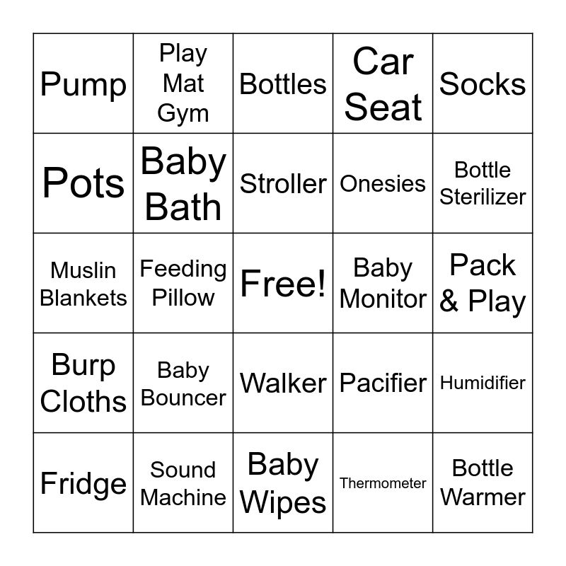 This bingo card has a free space and 26 words: Walker, Thermometer, Stroller, Sound Machine, Socks, Pump, Pots, Play Mat Gym, Pack & Play, Pacifier, Onesies, Muslin Blankets, Humidifier, Fridge, Feeding Pillow, Diapers, Car Seat, Burp Cloths, Bottles, Bottle Warmer, Bottle Sterilizer, Baby Wipes, Baby Monitor, Baby Bouncer, Baby Bath and Activity Center.