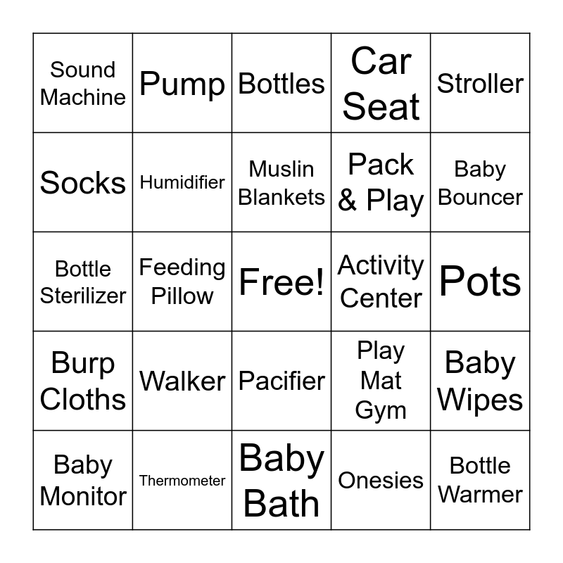 This bingo card has a free space and 26 words: Pacifier, Onesies, Muslin Blankets, Thermometer, Stroller, Sound Machine, Socks, Pump, Pots, Play Mat Gym, Pack & Play, Bottle Sterilizer, Baby Wipes, Baby Monitor, Feeding Pillow, Diapers, Car Seat, Burp Cloths, Bottles, Bottle Warmer, Baby Bouncer, Baby Bath, Activity Center, Walker, Humidifier and Fridge.