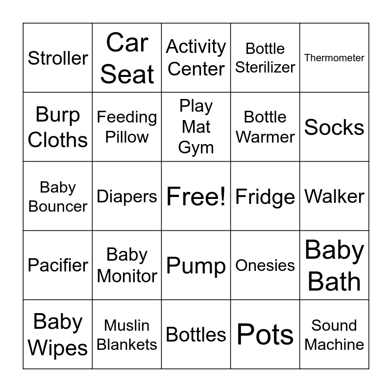 This bingo card has a free space and 26 words: Pump, Pots, Play Mat Gym, Muslin Blankets, Thermometer, Stroller, Burp Cloths, Car Seat, Walker, Onesies, Bottle Warmer, Baby Bouncer, Baby Bath, Baby Wipes, Diapers, Pack & Play, Bottle Sterilizer, Pacifier, Activity Center, Sound Machine, Socks, Bottles, Fridge, Baby Monitor, Feeding Pillow and Humidifier.