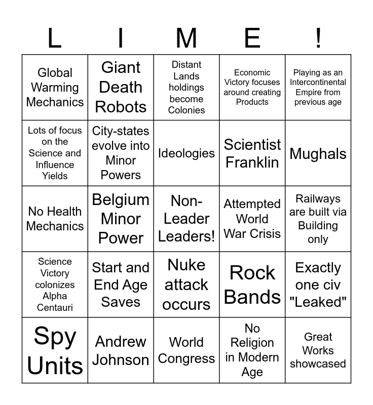 This bingo card has a free space and 24 words: Start and End Age Saves, Andrew Johnson, Ideologies, Spy Units, Playing as an Intercontinental Empire from previous age, Global Warming Mechanics, Lots of focus on the Science and Influence Yields, Giant Death Robots, Attempted World War Crisis, Nuke attack occurs, Scientist Franklin, No Health Mechanics, Rock Bands, Exactly one civ "Leaked", City-states evolve into Minor Powers, No Religion in Modern Age, Railways are built via Building only, Distant Lands holdings become Colonies, Mughals, Belgium Minor Power, Great Works showcased, Science Victory colonizes Alpha Centauri, Economic Victory focuses around creating Products and World Congress.