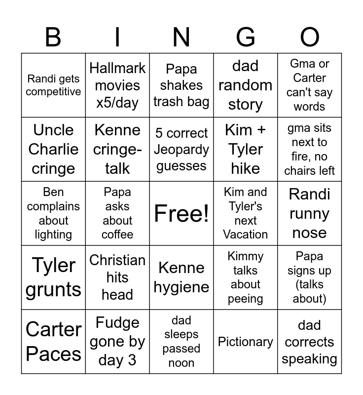 This bingo card has a free space and 33 words: Grandma says what 10x/day, Height Talk, Papa asks about coffee, Grandma talks about Papa not hearing, Tyler grunts, Kenne cringe-talk, Gma or Carter can't say words, Carter Paces, Hallmark movies x5/day, Sappy commercials, 5 correct Jeopardy guesses, Papa shakes trash bag, Mom wins in frustration, Girls win gmas game, Kim and Tyler's next Vacation, gma sits next to fire, no chairs left, Fudge gone by day 3, Ben complains about lighting, Christian hits head, Kimmy talks about peeing, Kenne hygiene, Grandma and Papa repeat same phrases, Randi gets competitive, Randi runny nose, dad sleeps passed noon, dad corrects speaking, dad random story, Kim + Tyler hike, Uncle Charlie cringe, Papa signs up (talks about), Mom or Gma wake up by snoring, Pictionary and No Dad games.