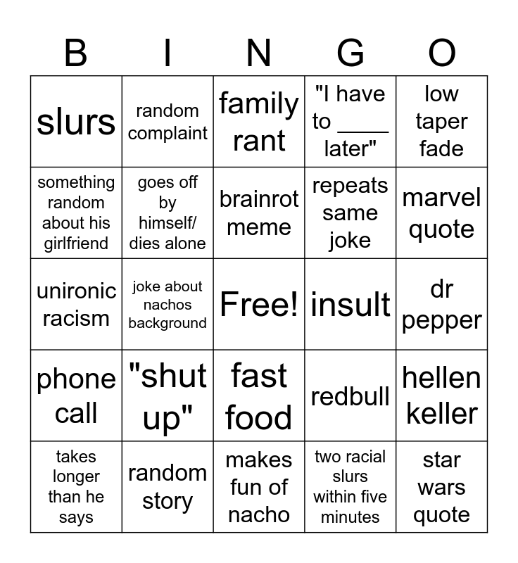 This bingo card has a free space and 26 words: fast food, two racial slurs within five minutes, brainrot meme, random story, low taper fade, slurs, something random about his girlfriend, random complaint, dr pepper, redbull, repeats same joke, unironic racism, hellen keller, takes longer than he says, joke about nachos background, random singing, "I have to ____ later", phone call, family rant, star wars quote, marvel quote, makes fun of nacho, insult, "shut up", goes off by himself/ dies alone and something abt pets.