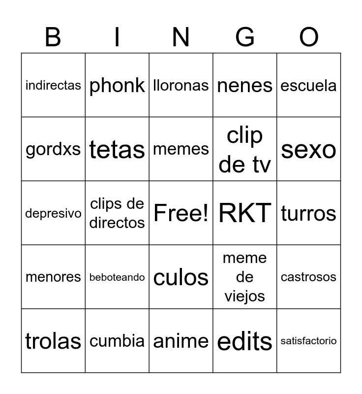 This bingo card has a free space and 24 words: beboteando, cumbia, memes, trolas, escuela, indirectas, gordxs, phonk, RKT, culos, clip de tv, depresivo, meme de viejos, castrosos, tetas, edits, turros, lloronas, sexo, clips de directos, satisfactorio, menores, nenes and anime.