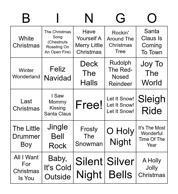 This bingo card has a free space and 25 words: Jingle Bell Rock, Silent Night, Deck The Halls, All I Want For Christmas Is You, Santa Claus Is Coming To Town, White Christmas, Winter Wonderland, The Christmas Song (Chestnuts Roasting On An Open Fire), Let It Snow! Let It Snow! Let It Snow!, Frosty The Snowman, Rudolph The Red-Nosed Reindeer, Last Christmas, O Holy Night, It's The Most Wonderful Time Of The Year, Feliz Navidad, Santa Baby, Sleigh Ride, Have Yourself A Merry Little Christmas, Joy To The World, I Saw Mommy Kissing Santa Claus, A Holly Jolly Christmas, Baby, It's Cold Outside, The Little Drummer Boy, Rockin' Around The Christmas Tree and Silver Bells.