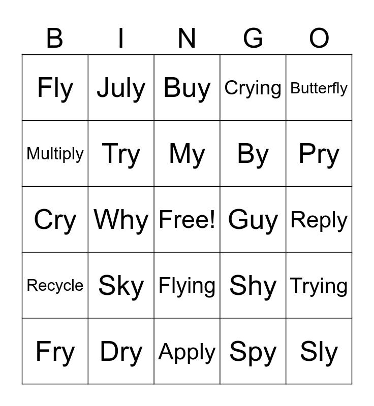 This bingo card has a free space and 24 words: Sky, Dry, My, Fry, Butterfly, Fly, Multiply, July, Guy, Flying, By, Cry, Shy, Trying, Try, Spy, Reply, Buy, Pry, Why, Sly, Recycle, Crying and Apply.