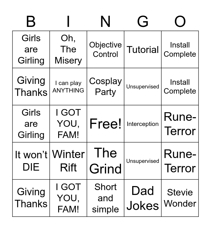 This bingo card has a free space and 48 words: Because you’re TWO, I GOT YOU, FAM!, Short and simple, Sharing is Caring, Install Complete, It won’t DIE, Oh, The Misery, Is This My Lane?, Interception, Stevie Wonder, Giving Thanks, I can play ANYTHING, Dad Jokes, Rune-Terror, STEALTH TIME!, “Headcanon”, Objective Control, Unsupervised, Matching portraits, Girls are Girling, Winter Rift, The Grind, Tutorial, Cosplay Party, Because you’re TWO, I GOT YOU, FAM!, Short and simple, Sharing is Caring, Install Complete, It won’t DIE, Oh, The Misery, Is This My Lane?, Interception, Stevie Wonder, Giving Thanks, I can play ANYTHING, Objective Control, Dad Jokes, Rune-Terror, STEALTH TIME!, “Headcanon”, The Grind, Unsupervised, Matching portraits, Girls are Girling, Winter Rift, Cosplay Party and Tutorial.