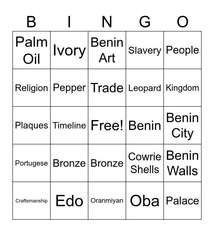 This bingo card has a free space and 26 words: Bronze, Oba, Trade, Edo, People, Palm Oil, Religion, Ivory, Benin City, Cowrie Shells, Leopard, Plaques, Benin Walls, Craftsmanship, Timeline, Rituals, Slavery, Portugese, Benin Art, Palace, Kingdom, Oranmiyan, Benin, Bronze, Pepper and Nigeria.